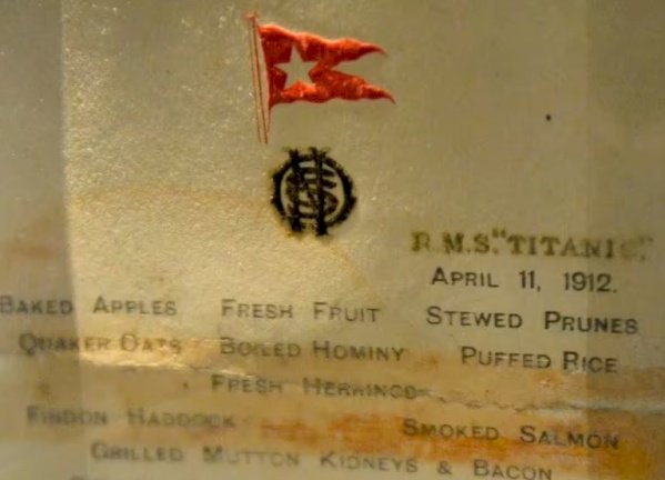 El documento, estimado entre 50.000 y 70.000 libras esterlinas (61.000 y 84.000 dólares), presenta los platos que fueron servidos durante la cena de la noche del 11 de abril, la cual incluía ostras, solomillo de ternera con crema de rábano picante y puré de chirivías. Entre los postres, Bordaloue -un tipo de tarta– de damasco y pudin Victoria.